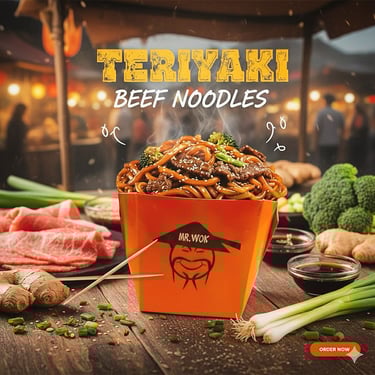 Dive into a box of our irresistible Teriyaki Beef Noodles from Mr. Wok. Tender beef, glossy teriyaki sauce, and perfect noodles—what are you waiting for?